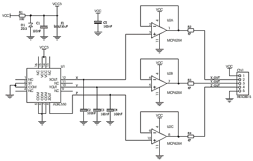 Ce petit module intègre un accéléromètre 3 axes ADXL330 d'Analog Devices™ (gamme ±3 g) associé à un amplificateur opérationnel délivrant des tensions analogiques proportionnelles aux accélérations (ou inclinaisons) subies par le module.