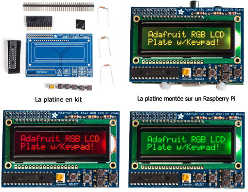 Cette platine (livrée en kit) prévue pour s'enficher sur les Raspberry B/B+/2/3/3B+/4 intègre un afficheur LCD alphanumérique 2 lignes de 16 caractères (avec rétro-éclairage RGB) ainsi que 5 bouton-poussoirs.