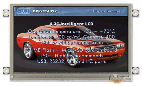 Cet afficheur graphique couleur tactile 4,3" (480 x 272 pixels) se pilote via des ordres simples au moyen d'une liaison série, SPI, I2C ou USB.