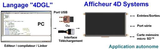 Le programme écrit sous "4DGL" pourra être téléchargé dans le uLCD-43PT via le port USB du PC (au moyen d'un petit module ou d'un câble USB additionnel - proposés en bas de page). Dès lors l'ensemble pourra être déconnecté du PC afin que vous disposiez d'un système autonome sur lequel votre programme pourra s'exécuter.