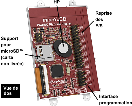 Pouvant être utilisé de façon "autonome" (sans nécessiter l’utilisation d’un microcontrôleur externe) ou en mode "esclave" (devant dans ce cas être piloté par votre propre microcontrôleur au moyen d’une liaison série), cet afficheur dispose également au dos d'un connecteur capable de recevoir une carte au format microSD™ (la carte mémoire n'est pas livrée). Cette carte pourra être utilisée pour stocker des données, des sons ou des images afin de les rappeler immédiatement à l'écran.