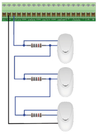 Ce type de câblage à 3 résistances EOL permet également de pouvoir différencier 3 détecteurs en série sur une installation existante juste en ajoutant 1 résistance en parallèle sur chaque sortie alarme des détecteurs.