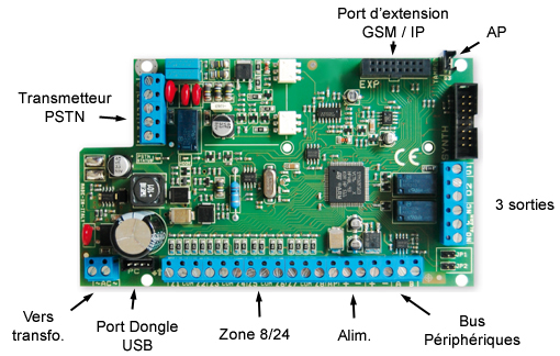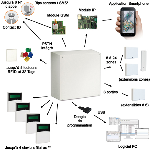 - 8 à 24 zones filaires selon mode de câblage (sans aucun module d'extention additionnel) extensible à 32*