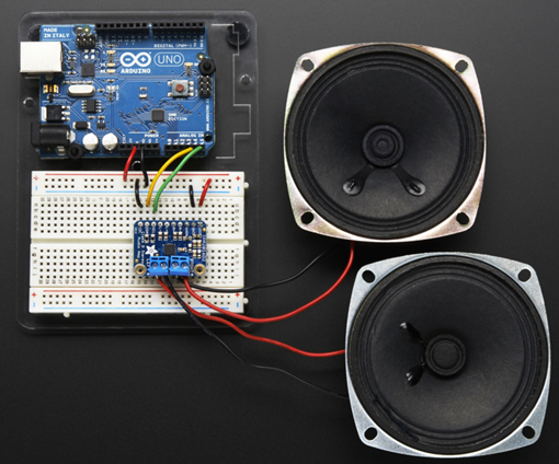 Exemple d'application (platine Arduino, hauts-parleurs, straps et plaque breadboard non inclus)