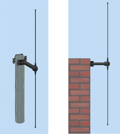 Antenne de base double brin rigide 169 - 172 MHz omnidirectionnelle pour montage sur poteau (Ø 40 - 60 mm) ou mur - Sortie sur câble 1 m avec connecteur SMA mâle en bout.