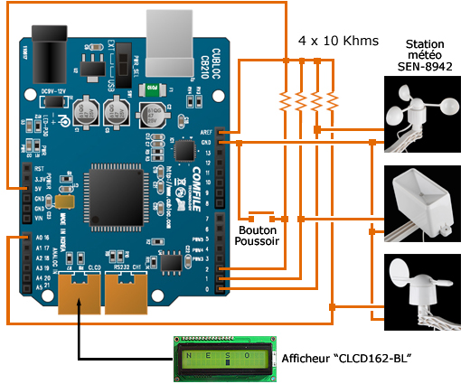 Cette application montre comment gérer un capteur météo afin de pouvoir afficher une représentation de la vitesse du vent, du niveau de pluviométrie et de la direction du vent sur un afficheur LCD 2 x 16 caractères. Un bouton-poussoir permet d'afficher successivement ces 3 informations à l'écran.