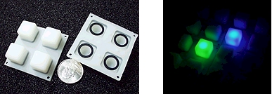Ces 16 boutons (2 x 2) de grandes dimensions en silicone souple blanche légèrement translucide disposent d'un trou sur la face arrière qui permet d'y intégrer une Leds de 3 ou 5 mm (non livrée) mono-couleur ou multi-couleurs.
