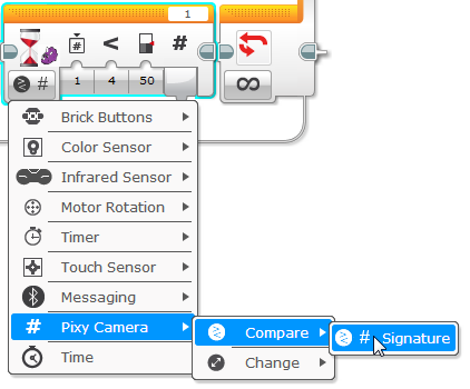 Il vous suffira ensuite d'utiliser simplement le block de programmation pour exploiter simplement votre caméra Pixy pour effectuer diverse taches de reconnaissances..