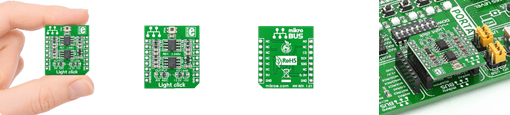 Ce module Click Board vous permettra d'ajouter la possibilités de mesurer la luminosité ambiante depuis votre microcontrôleur, par le biais d'un circuit intégré PD15-22CRT8, couplé à un MAX6106 et à un convertisseur ADC MCP3201.