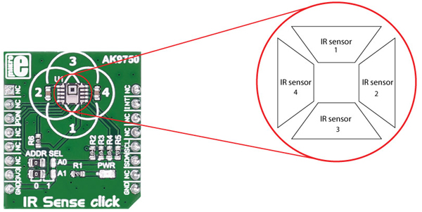 Ce module Click Board vous permettra de détecter la présence d'un objet ou corps dégageant de la chaleur (en mouvement ou fixe) grâce à ses 4 zones de détections. Ce dernier est architecturé sur la base d'un AK9750 à liaison I2C.