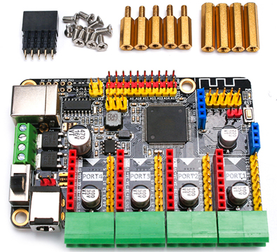 La platine peut recevoir en option un module Bluetooth (pour un pilotage à distance depuis une tablette ou Smartphone) ainsi qu'un module d'adaptation RJ25 pour disposer de 4 ports permettant l'utilisation rapide des modules "Me de chez Makeblock".