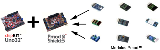 Cette platine shield (une fois insérée sur la platine chipKIT Uno32™) vous permettra de pouvoir en étendre les possibilités grâce à la présence de 5 connecteurs capables de recevoir des modules d'extensions Pmods™.
