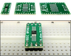 Cet petit circuit imprimé composé de 3 zones adaptatrices SOIC/DIL seccables permet de souder des composants 8, 20 ou 28 broches aux pas de 0,65 mm.