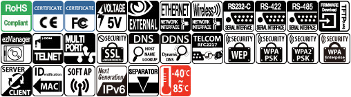 - Protocole TCP, UDP, IPv4/IPv6 dual stack, ICMPv6/TCPv6/UDPv6/ICMP, ARP, DHCP, PPoE, DNS, DDNS(Dynamic DNS), Telnel,Telnet COM Port Control Option (RFC2217), SSLSecuritéWEP / WPA-PSK / WPA2-PSK/WPA-Entreprise (EAP-TLS, EAP-TTLS, PEAP)