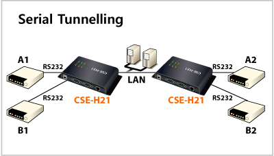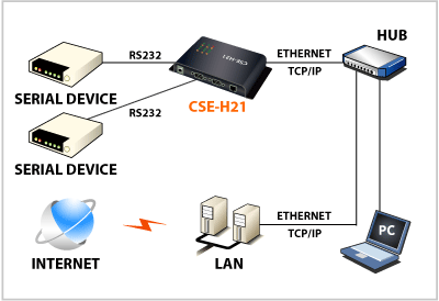 Ce boîtier permettra donc d'implémenter rapidement une communication réseau TCP/IP à deux périphériques dotés d'une liaison série. En utilisant un boîtier "CSE-H21", votre application sera dès lors accessible depuis n'importe quel point du réseau (et éventuellement depuis l'extérieur via Internet).