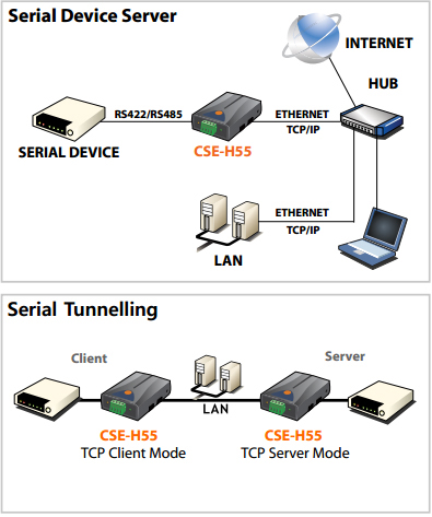 Doté d'une adresse MAC unique, le "CSE-H55N" pourra se voir attribuer une adresse IP et une valeur de masque au choix. Il vous sera également possible (grâce à un utilitaire dédié) de programmer son firmware afin qu'il puisse être utilisé au choix en mode Serveur (T2S), en mode Client (COD), en utilisation via commandes AT (ATC) ou pour des communications UDP (U2S).