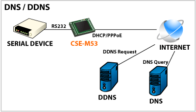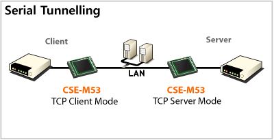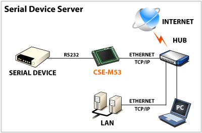 En utilisant le module "CSE-M53G", votre application sera dès lors accessible depuis n'importe quel point du réseau (et éventuellement depuis l'extérieur via Internet). Grâce à lui vous pourrez communiquer avec n'importe quel dispositif série au travers d'une liaison Ethernet / Internet (10/100 Base-T). Pour ce faire, il vous sera possible (via un utilitaire dédié) de programmer le firmware du boîtier afin qu'il puisse être utilisé au choix en mode Serveur (T2S), en mode Client (COD), en utilisation via commandes AT (ATC) ou pour des communications UDP (U2S).