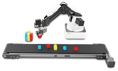 Voici un mini convoyeur de 60 cm entièrement programmable, avec tapis roulant à bande rugueuse, capteur de vitesse, de distance et de couleur à associer à un bras robotisé DOBOT Magician. L'ensemble vous permettra de simuler à la perfection un chaîne de production complète.