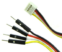Chaque cordon est équipé à une extrémité d'un connecteur mâle 4 broches avec détrompeur et système de verrouillage et à l'autre extrémité de 4 connecteurs mâles séparés mono-broche (type jumper).