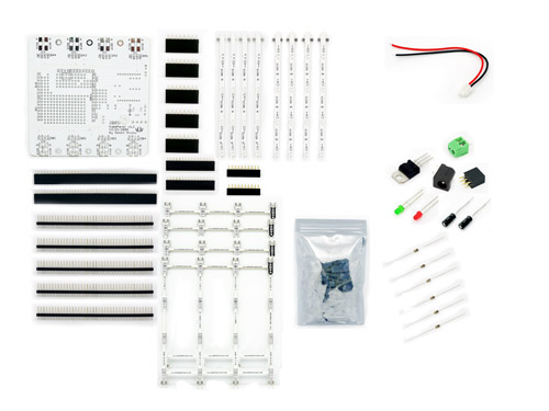 Livré complet avec circuits imprimés, connecteurs, leds (dont 6 de rechanges), résistances, et autres composants divers, chaque led est pilotable indépendament et la platine pourra recevoir en option un module XBEE.