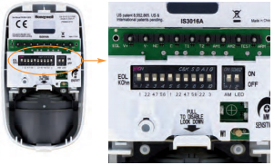 Les valeurs des 3 résistances fin de ligne (EOL) pour la détection, l'autoprotection et l'anti-masque sont réglables indépendamment par dip-switch (plusieurs valeurs possibles) et sont désactivables si besoins (pour une utilisation en câblage de type Normalement Fermé standard).