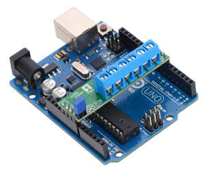 Equipé d'un driver A4990, le module Dual Motor Shield A4990 à enficher sur une carte Arduino (non incluse) vous permettra de piloter 2 moteurs "cc" ( 6 à 32 V / 0,9 A max.) ou un moteur pas-à-pas bipolaire.