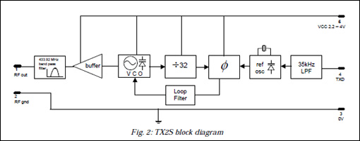 Doté de dimensions réduites (20 x 10 x 2 mm) et conforme aux normes EMC EN 301 489-3 et EN 300-220-3, il devra être associé à un circuit intégré de codage ou à un microcontrôleur effectuant un codage de type Manchester, PCM ou autre en respectant les temps de cycle en vigueur pour cette bande.