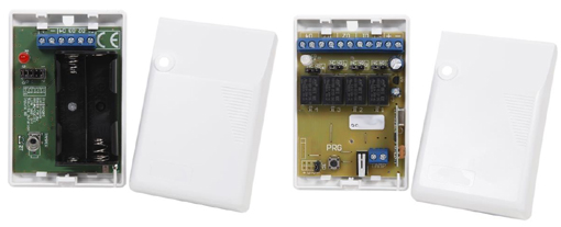 Le récepteur prévu pour un usage intérieur est livré dans un petit boîtier blanc élégant avec un contact d'auto-protection à l'ouverture. Ce dernier dispose d'une sortie spécifique pouvant recevoir un buzzer (non livré) permettant de connaître l'état du relais (activé ou désactivé). Les 4 sorties relais peut être indépendamment configurées selon 4 mode de fonctionnement.