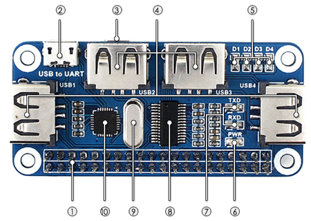 3. Connecteur microUSB au dos de la platine pour raccorder le HUB à votre Raspberry Pi