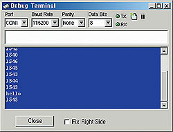 Afin de faciliter la phase de mise au point et de développement, il vous sera possible de positionner des instruction spéciales à certaines lignes de votre programme qui vous permettrons de "remonter" la valeur de vos variables ainsi que d'autres informations diverses vers une fenêtre de Debug sur le PC.
