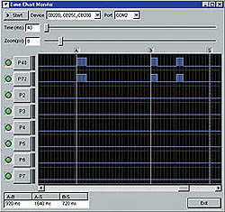 Le second est un écran analyseur qui vous permettra lorsque le CUBLOC™ est en action de faire l’acquisition de 8 de ses Relays (avec possibilité de réglage de la base de temps) afin de pouvoir ensuite visualiser toute la séquence mémorisée (avec des fonctions zoom) tout en ayant à votre disposition des curseurs de mesures que vous pourrez déplacer sur les différents signaux.