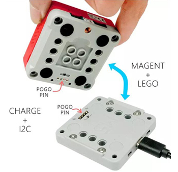 - Une partie basse qui une fois démontée (à l'aide de la clef Hex livrée) laisse apparaître une large zone de prototypage pastillée au pas de 2,54 mm qui vous permettra de souder vos propres composants. Ce circuit comprend un connecteur POGO 4 broches ainsi qu'un connecteur USB type C pour recharger l'accus de la partie M5 GO ou avoir accès au port I2C. Cette partie se fixe très simplement par aimantation au 2 premières. Elle est également magnétique, dispose de 4 pieds de protection en caoutchouc et 6 trous compatibles LEGO®.
