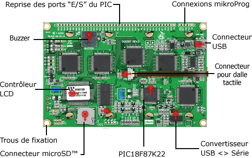 Une rangée de broches au pas de 2,54 mm permet la reprise des ports du microcontrôleur. Une seconde rangée de broches permet le raccordement de boîtier optionnel "mikroProg". Ce boîtier vous permettra de programmer le PIC de l'afficheur (sans utiliser son bootloader) et surtout de débugger votre application (à condition que vous programmiez celle-ci à l'aide d'un des compilateurs mikrorelektronika).