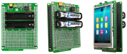 Cette platine est conçue pour s'enficher au dos des afficheurs graphiques mikromedia afin que vous puissiez les alimenter au moyen de 2 piles 1,5 V de type AAA (non livrées). La platine intègre également une zone de prototypage.