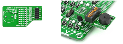 Ce petit module équipé d'un buzzer piezo (20 Hz à 20 KHz) est spécialement conçu pour être enficher sur les platines de développement Mikroelektronika (ou une platine de votre conception).