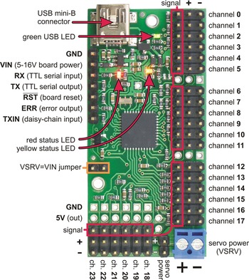 Cette petite platine peut piloter jusqu'à 24 servomoteurs depuis le port USB d'un ordinateur ou depuis une liaison série TTL (d'un microcontrôleur) ou en mode autonome suivant un script programmable de 3000 positions).