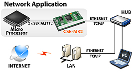 | Synoptique d'utilisation: Cette platine permettra donc d'effectuer un test de communication réseau TCP/IP au moyen du module "MSE-M32" en un minimum de temps. Elle est donc toute indiquée pour l'évaluation et l'étude du module "MSE-M32" en vue de l'intégration de ce module "OEM" au sein de votre application. |