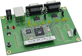 Cette platine vous permettra de tester rapidement et simplement les possibilités du module "CSE-M32". Cette dernière comprend un connecteur magnétique isolé "RJ-45" dédié à la connexion Ethernet ainsi que 2 prises SUB-D 9 broches (pour les liaisons séries "RS-232").