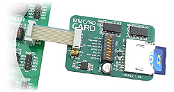 Cette platine intègre un support de carte MMC™ / SD™ (la carte n'est pas livrée) ainsi qu'un câble plat destiné à être raccordé sur un port d'entrées/sorties de votre microcontrôleur.