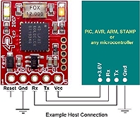 La platine s'interface très simplement au moyen d'un port de communication série (TX / RX au niveau logique 0 / 3.3 V). Si le système hôte dispose d'une tension supérieur à 3.3 V sur sa sortie TX, il vous faudra alors ajouter une résistance de l'odre de 100 à 220 ohms en série sur la broche RX du module.