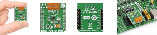 Equipé d'un circuit TPL0501, ce module Click Board s'apparente à un potentiomètre digital (d'une valeur de 100 KOhms ±20%). Doté d'une résolution de conversion sur 8 bits, il s'adresse et se pilote via une communication SPI™.