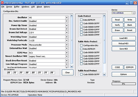 La platine est livrée avec un PIC18F8520 TQFP pré-soudé. La platine dispose d'un programmateur intégré qui vous permettra de lire, d'effacer et de programmer le PIC (SANS BOOT Loader). C'est à dire que le PIC présent sur la platine est un PIC vierge standard.