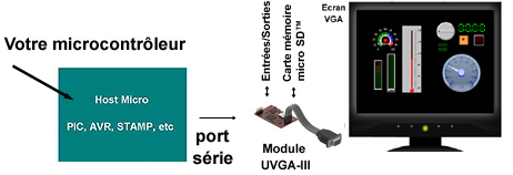 Le programme écrit sous "4DGL" pourra être téléchargé dans le UVGA-III via le port USB du PC (au moyen d'un petit module ou d'un câble USB additionnel - proposés en bas de page). Dès lors l'ensemble pourra être déconnecté du PC afin que vous disposiez d'un système autonome sur lequel votre programme pourra s'exécuter.