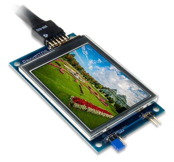 L'avantage de cet afficheur est qu'il dispose d'une large bibliothèque permettant à l'utilisateur de l'interfacer très rapidement avec très peu de ligne de code via une interface SPI. Ce dernier existe également en version Shield compatible Arduino™.