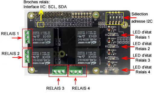 Cette platine pour Raspberry (toutes versions) vous permettra d'ajouter facilement 4 sorties relais à vos applications, lesquelles seront contrôlées via une liaison I2C.