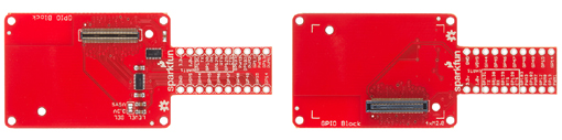 La platine dispose de part et d'autre d'un connecteur 70 broches (mâle d'un côté et femelle de l'autre) afin de pouvoir l'empiler sur d'autres modules SparkFun Blocks (non inclus).
