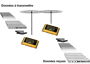 "SP2-433-160" (par packet max. de 60 octets) via un port parallèle 4 bits (par l'intermédiaire de votre microcontrôleur) pour que ces dernières soient alors transmises (de façon transparente pour l'utilisateur) par voie radio pour être ensuite disponibles dans le buffer de réception de tous les autres "SP2-433-160" présents dans la zone de couverture radio. En instaurant un système d'adresse dans les informations envoyées, il est ainsi possible de créer très facilement de puissants réseaux de transmission de données multi-points.