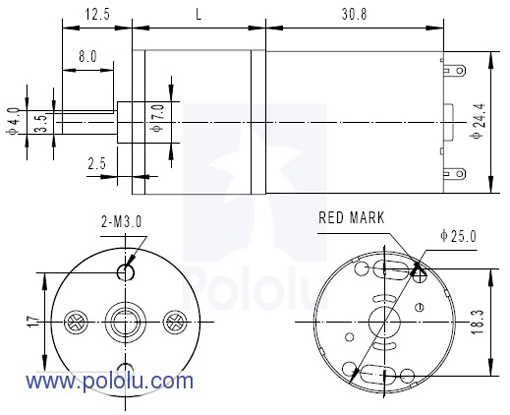 Ce motoréducteur (avec pignons en métal) bénéficie d'un rapport de réduction de 9.68:1. Il dispose d'un arbre en "D" (avec méplat). Alimentation: 6 Vcc.