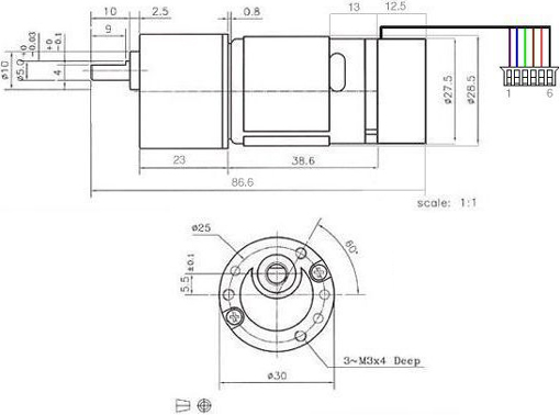 Motoréducteur (pour robotique, automate, etc...) avec encodeur (360 impulsions/révolution - Rapport: 1:30). Sortie sur connecteur femelle 6 contacts. Alimentation: 12 Vcc.