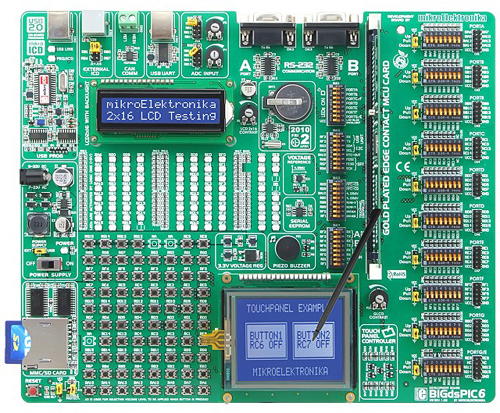 La platine dispose également d'un étage débuggeur ICD intégré vous permettant (si vous avez développé vos applications à l'aide des compilateurs MikrodsBASIC, MikrodsC ou MikrodsPASCAL) de vérifier sur l'écran de votre PC les valeurs de vos variables, les valeurs des registres spéciaux (SFR) ou encore l'état de la mémoire EEPROM pendant l'exécution de votre programme afin de vous faire bénéficier d'un outil de mise au point extrêmement puissant et performant.
